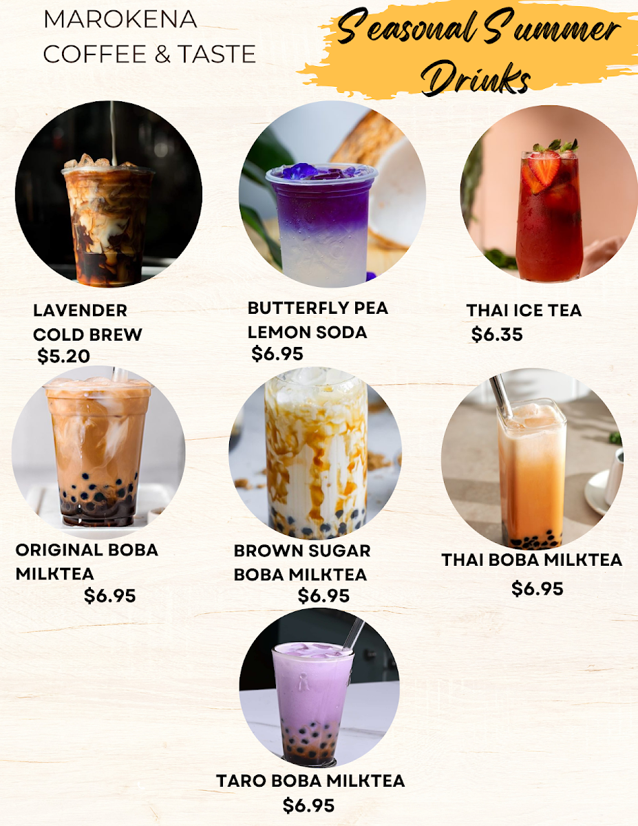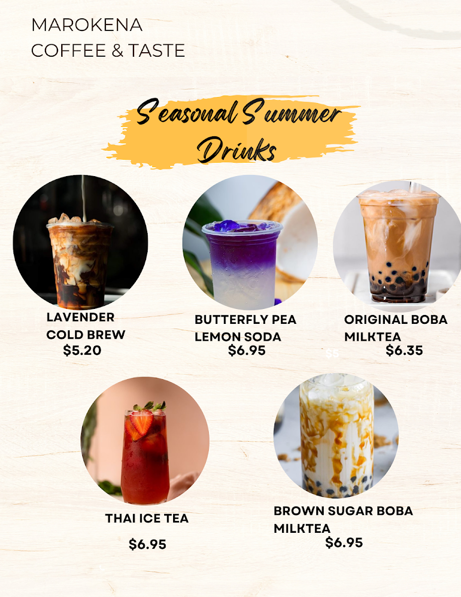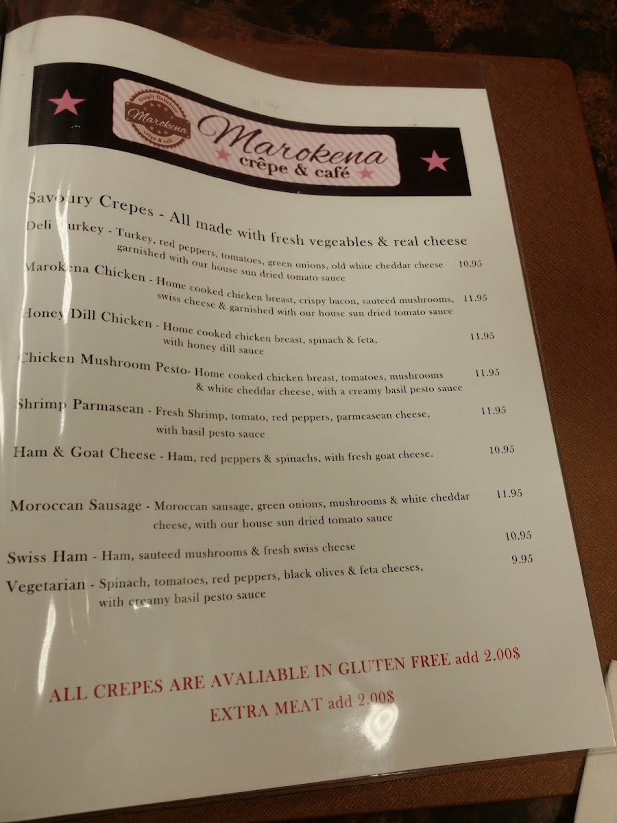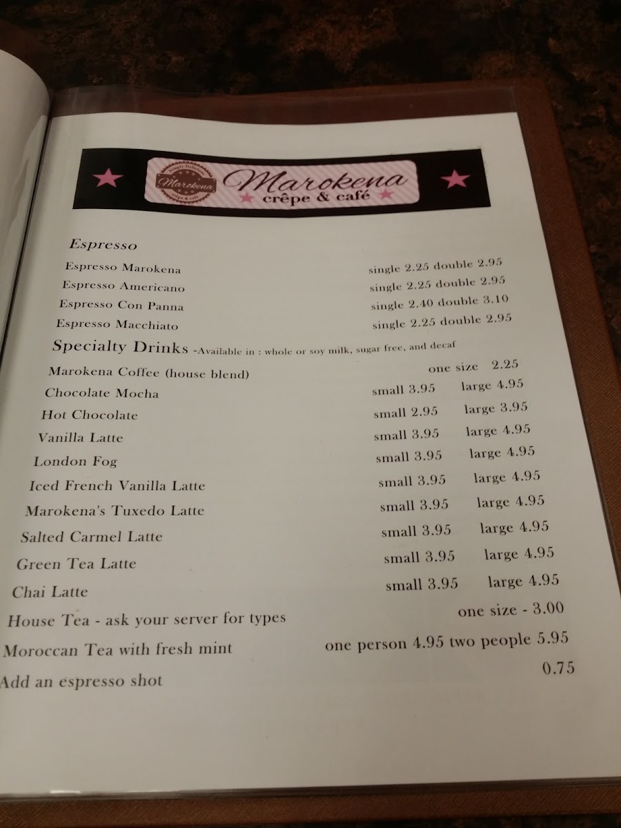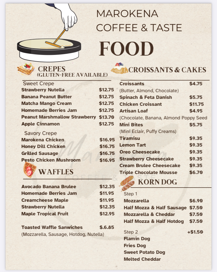 Marokena Coffee and Tastes offers a menu focused on coffee beverages and dessert items, with an emphasis on crepes and light meals. The selections include a variety of crepes such as savory options like Moroccan Sausage and gluten-free choices including Cinnamon Apple Crepes. In addition to crepes, the menu features soups such as Potato and Bacon Soup and dessert specialties like Peach Vanilla and Raspberry Crepes.